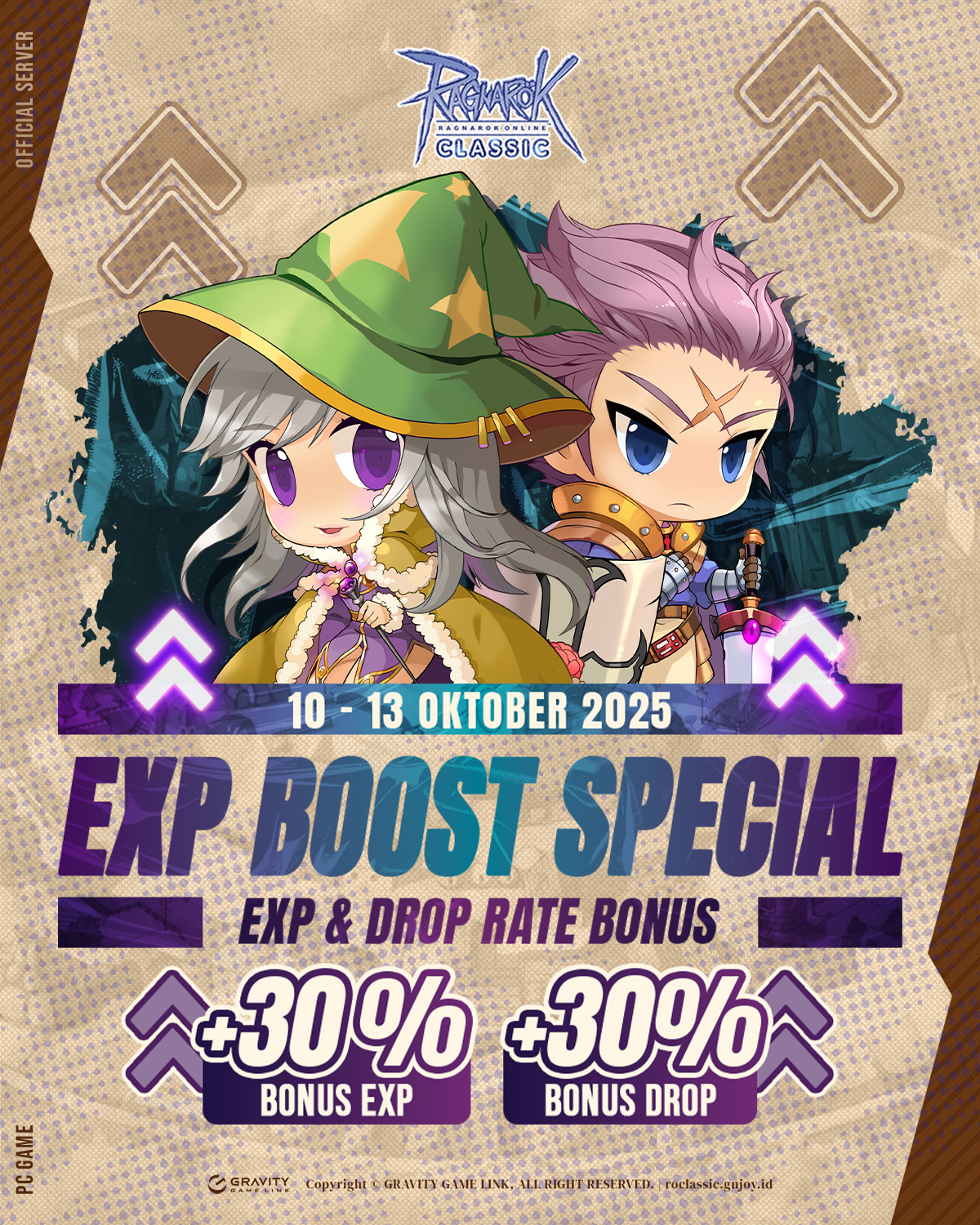 Hari yang ditunggu tunggu petualang telah tiba!! Tim Ragnarok Classic mengadakan Weekend EXP Boost Special Event agar leveling semakin lancar~
