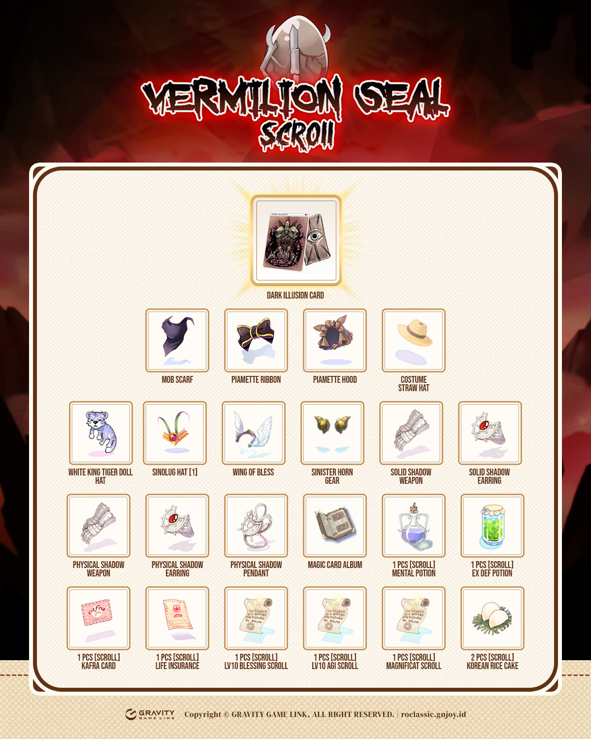 Dengan membeli Scroll ini, RO Mania sekalian memiliki kesempatan untuk mendapatkan berbagai macam item eksklusif secara acak dimulai dari: