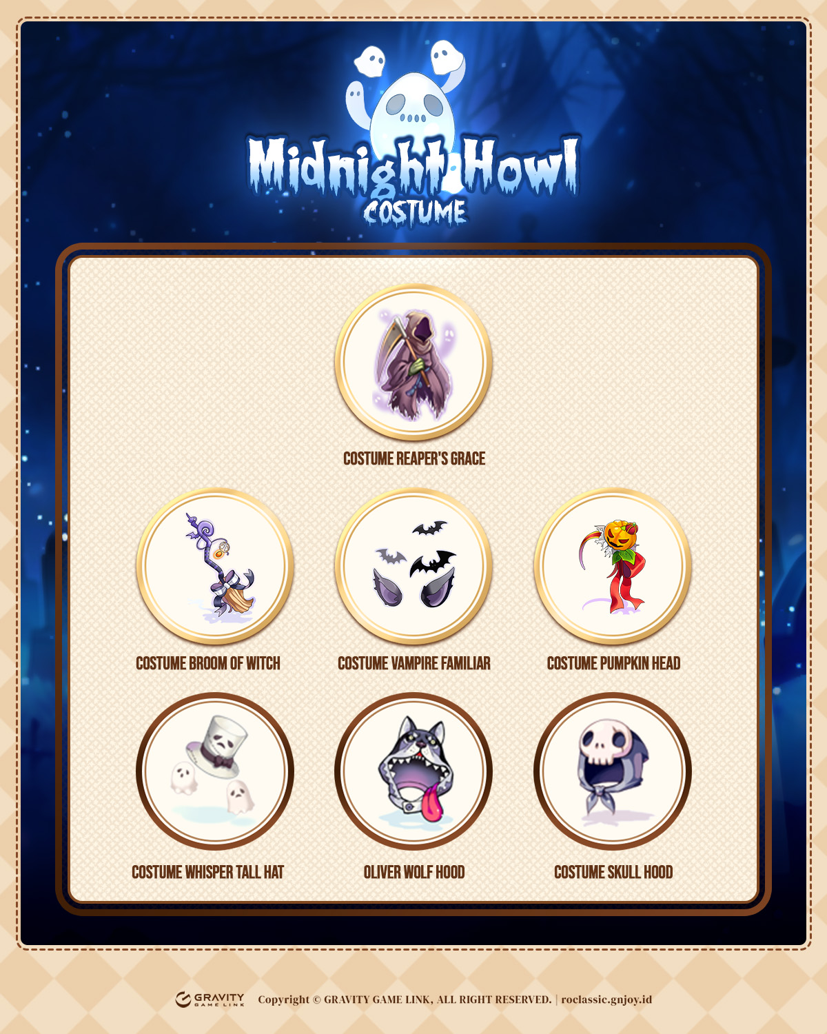 Berikut daftar Costume yang bisa kamu dapatkan dari MIDNIGHT HOWL COSTUME SCROLL: