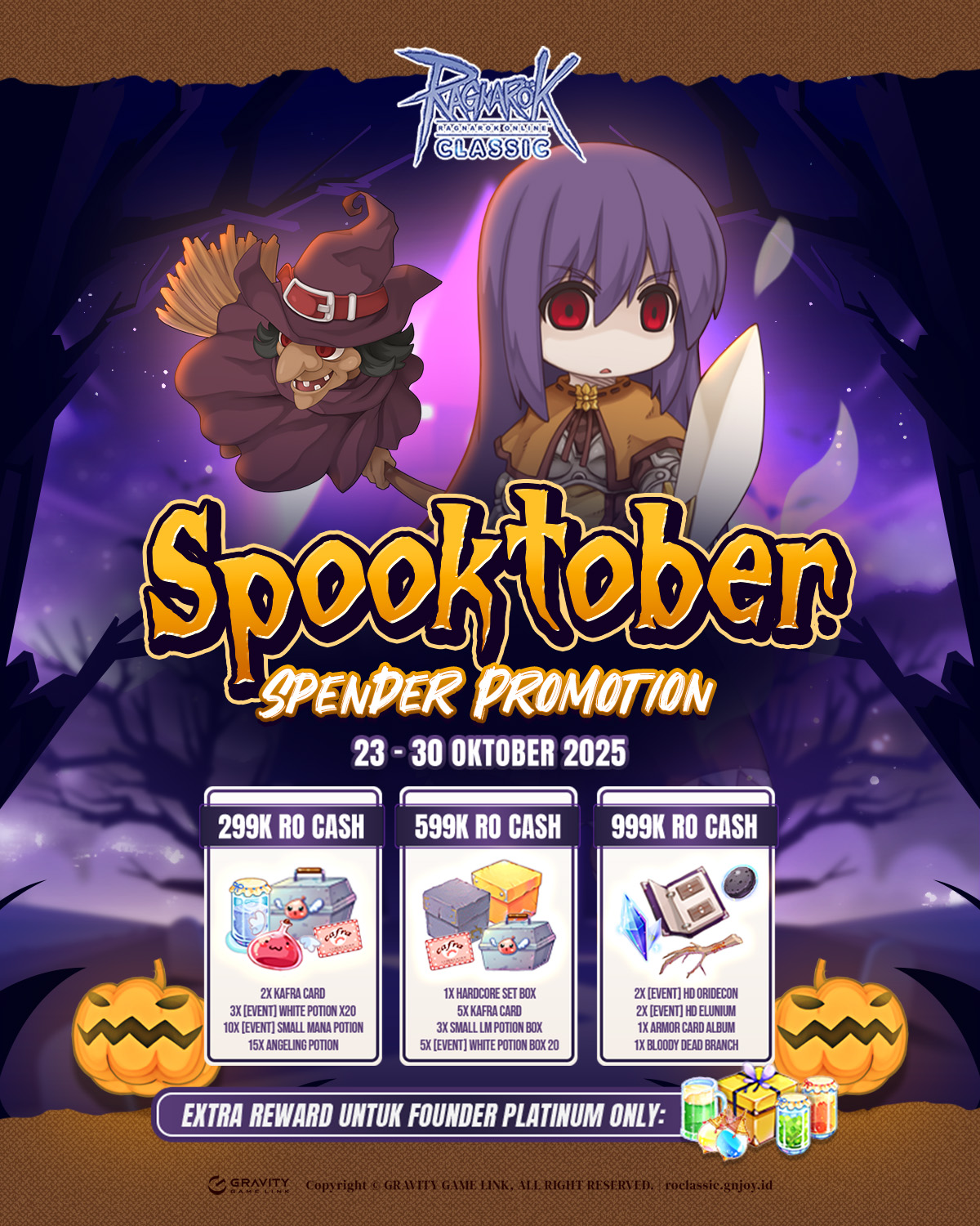 - Event ini hanya berlaku untuk Spend/ Pembelanjaan RO Cash, tidak berlaku untuk Topup RO Cash ataupun pembelian item Flash Sale (Pembelian melalui Website, Untuk Flash Sale ingame termasuk hitungan Spender Promotion).
