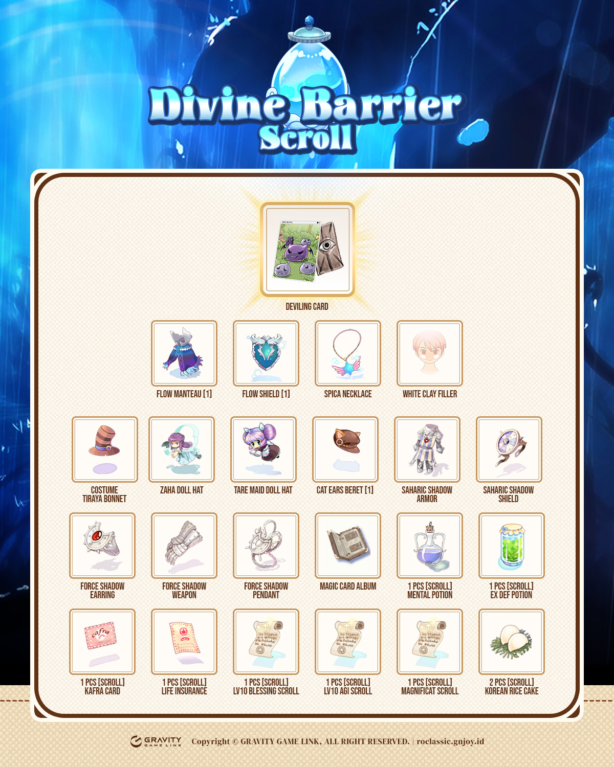 Tim Ragnarok Classic telah menghadirkan kembali Scroll Eksklusif bertema pelindung suci yang berisi kostum, equipment dan consumable spesial yang tentunya sangat cocok untuk menemani petualanganmu di Rune Midgard~!