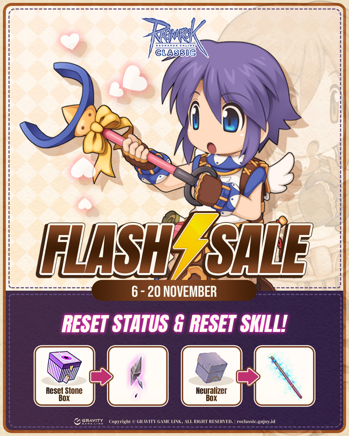 Tim Ragnarok Classic mengadakan event Flash Sale yang berisi Reset Stone Box dan Neuralizer Box untuk membantu RO Mania mempersiapkan karakter untuk Event Golden Emperium Season II !