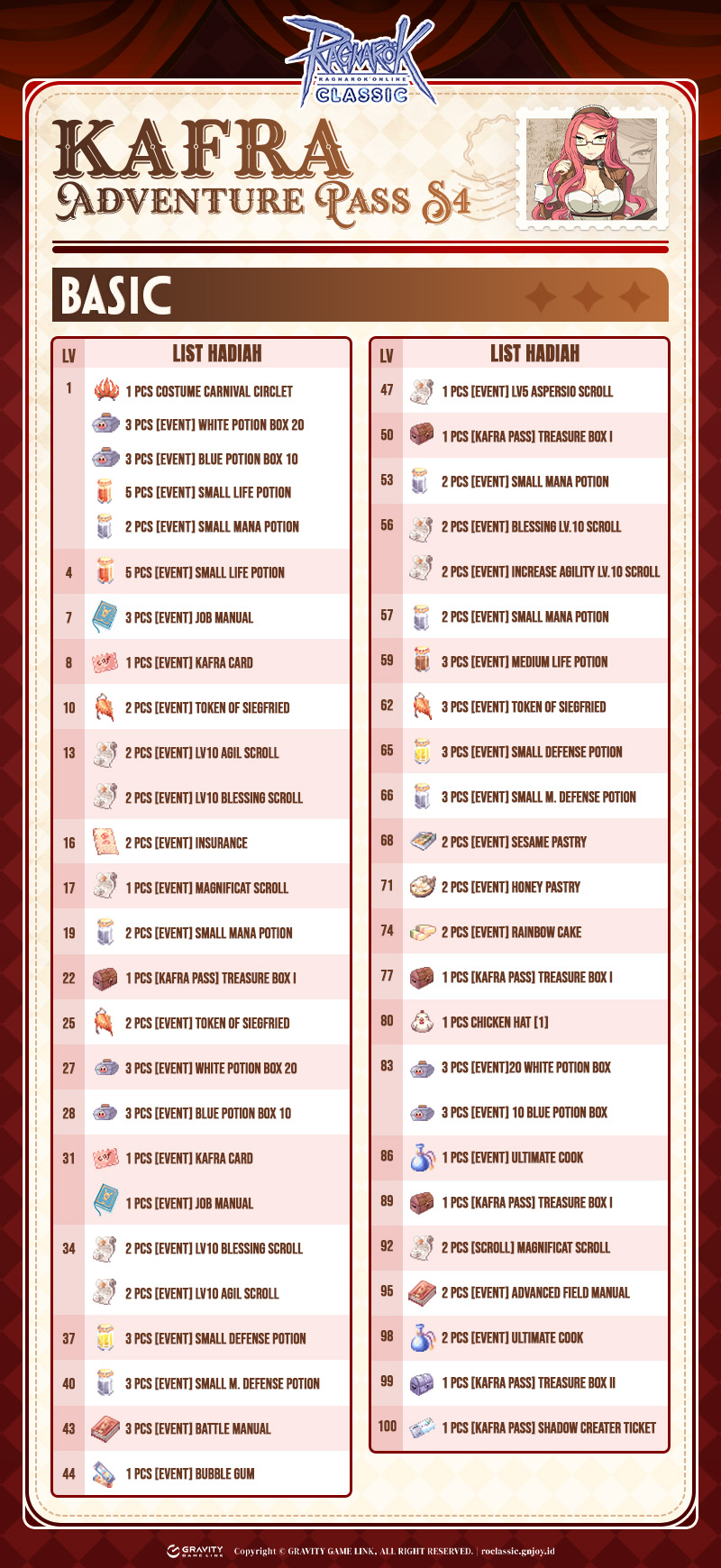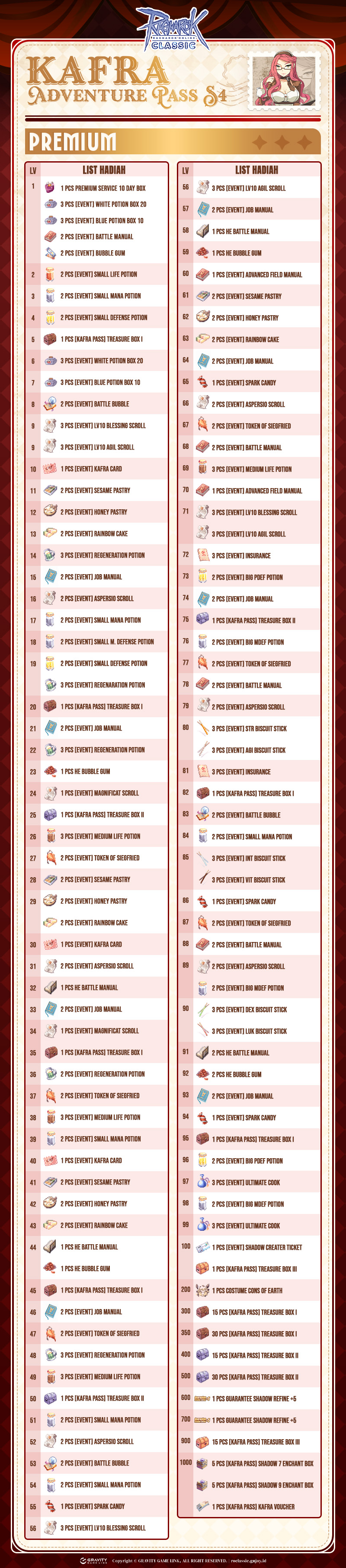 Catatan: Kamu juga akan mendapatkan hadiah Basic Kafra Pass jika kamu memiliki [Premium] Kafra Adventure Pass.
