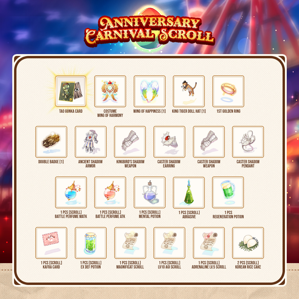 Tim Ragnarok Classic telah menghadirkan kembali Scroll Eksklusif bertema Anniversary Ragnarok Classic, berisi equipment dan consumable spesial yang tentunya sangat cocok untuk menemani petualanganmu di Rune Midgard~!