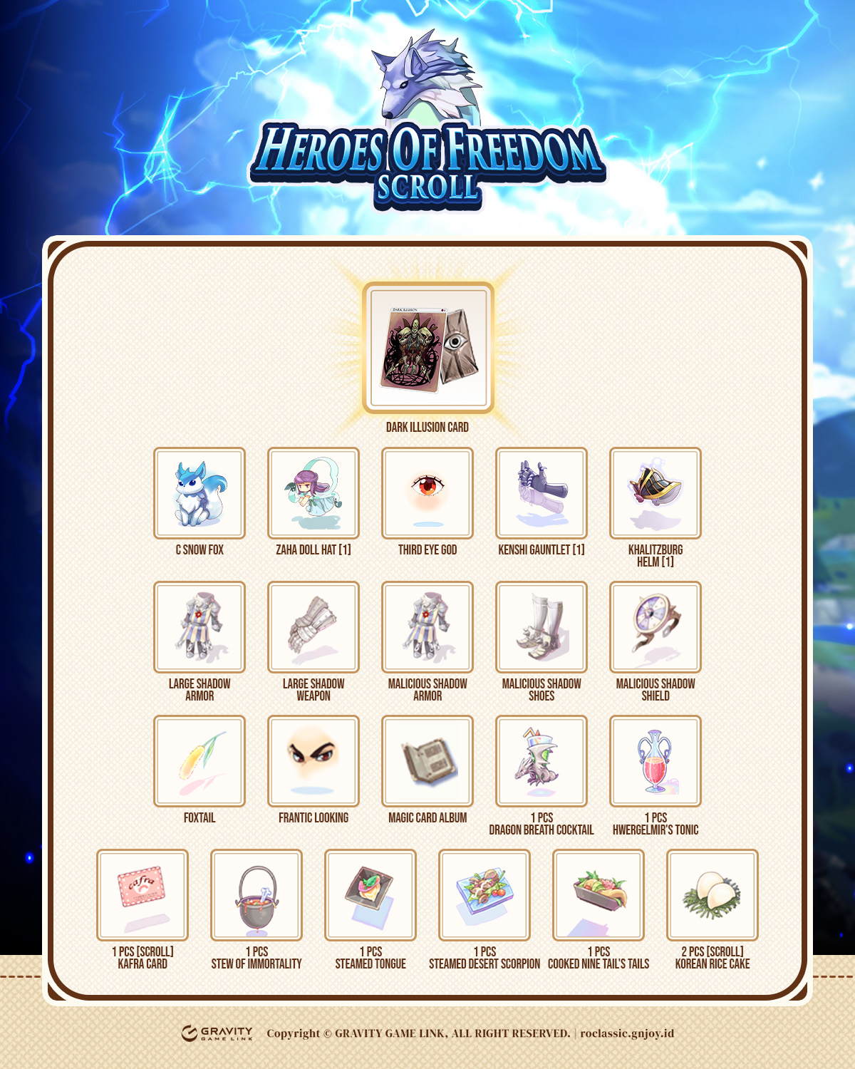 Tim Ragnarok Classic telah menghadirkan Scroll Eksklusif bernuansa kepahlawanan dan kemerdekaan yang berisi kostum, equipment dan consumable spesial yang tentunya sangat cocok untuk menemani petualanganmu di Rune Midgard~!