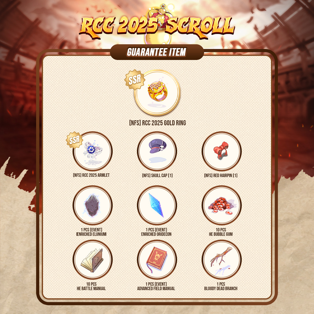 *Note : Ini hanya berlaku untuk RCC Scroll 2025. - Namun, jika karaktermu sudah mendapatkan item tier SSR sebelum mencapai Guarantee ITEM SSR , maka Guarantee Point di karaktermu akan direset menjadi 0.