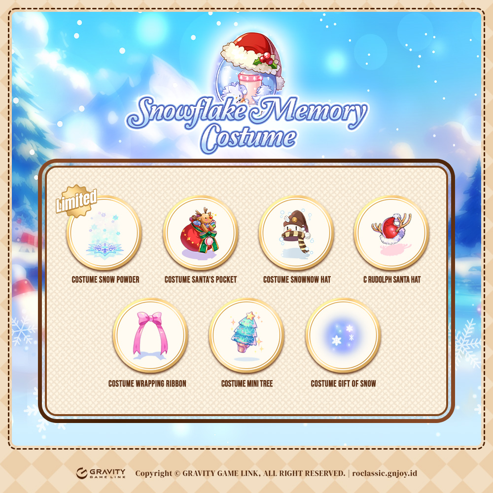 [Costume Limited hanya bisa di dapatkan pada tanggal 18 Desember 2025 - 8 Januari 2026 Pk. 07:59 WIB] Kostum yang memberikan suasana musim dingin di sekitarmu. Dapat ditukarkan dengan Costume Enchant Stone Box 7. Jenis : Costume Item dapat dimasukkan ke dalam storage. |