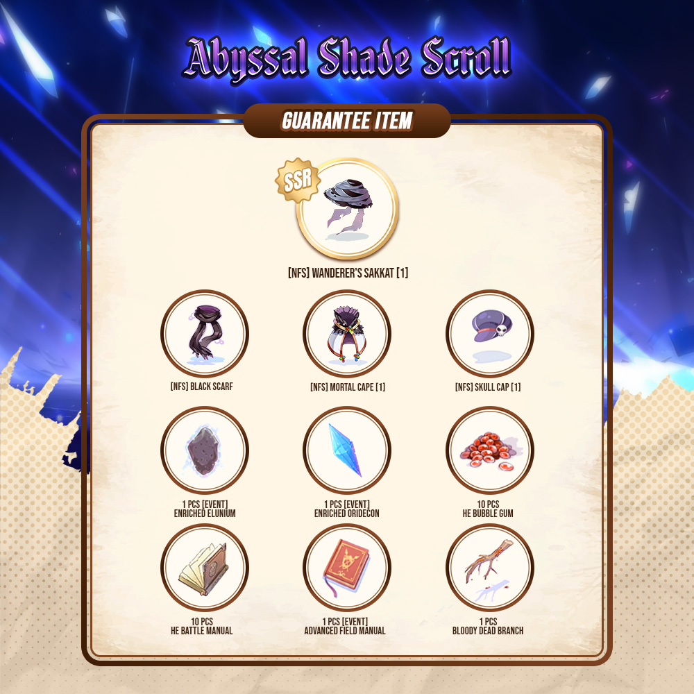 *Note : Ini hanya berlaku untuk Abyssal Shade Scroll 2025. - Namun, jika karaktermu sudah mendapatkan item tier SSR sebelum mencapai Guarantee ITEM SSR , maka Guarantee Point di karaktermu akan direset menjadi 0.