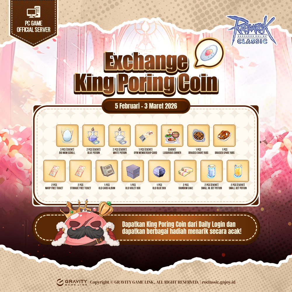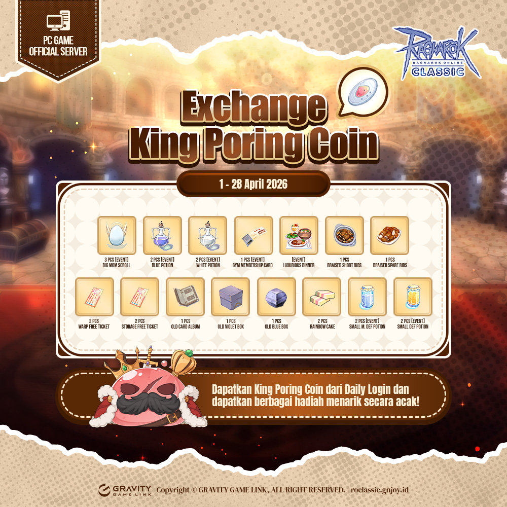 Untuk Menukarkan King Poring Coin, kamu akan diberikan 2 pilihan : 1 King Poring Coin + 100.000 Zeny. Atau 5 King Poring Coin.