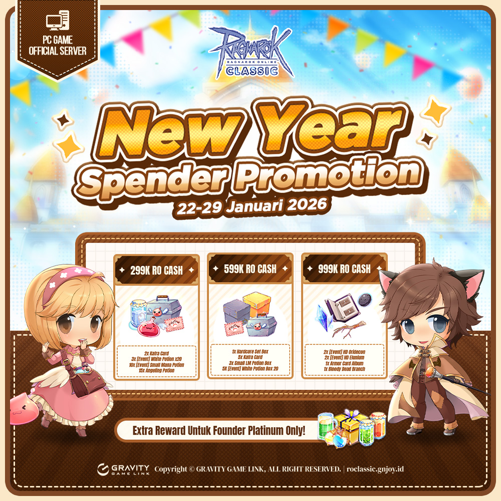 - Event ini hanya berlaku untuk Spend/ Pembelanjaan RO Cash, tidak berlaku untuk Topup RO Cash ataupun pembelian item Flash Sale (Pembelian melalui Website, Untuk Flash Sale ingame termasuk hitungan Spender Promotion).