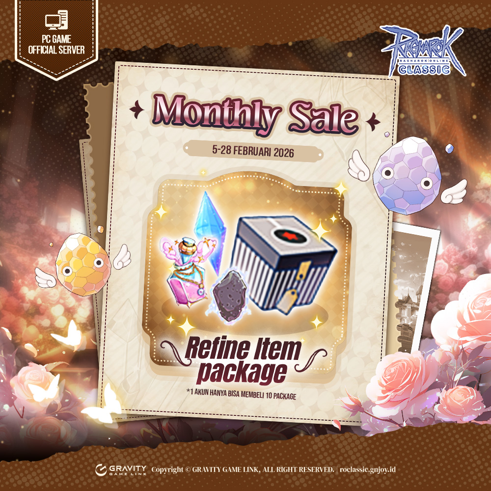 Monthly Sale Refine Item Package hadir lagi loh bulan ini, Tim Ragnarok Classic sudah menyiapkan MONTHLY SALE yang berisi kebutuhan-kebutuhan tempa untuk RO Mania!