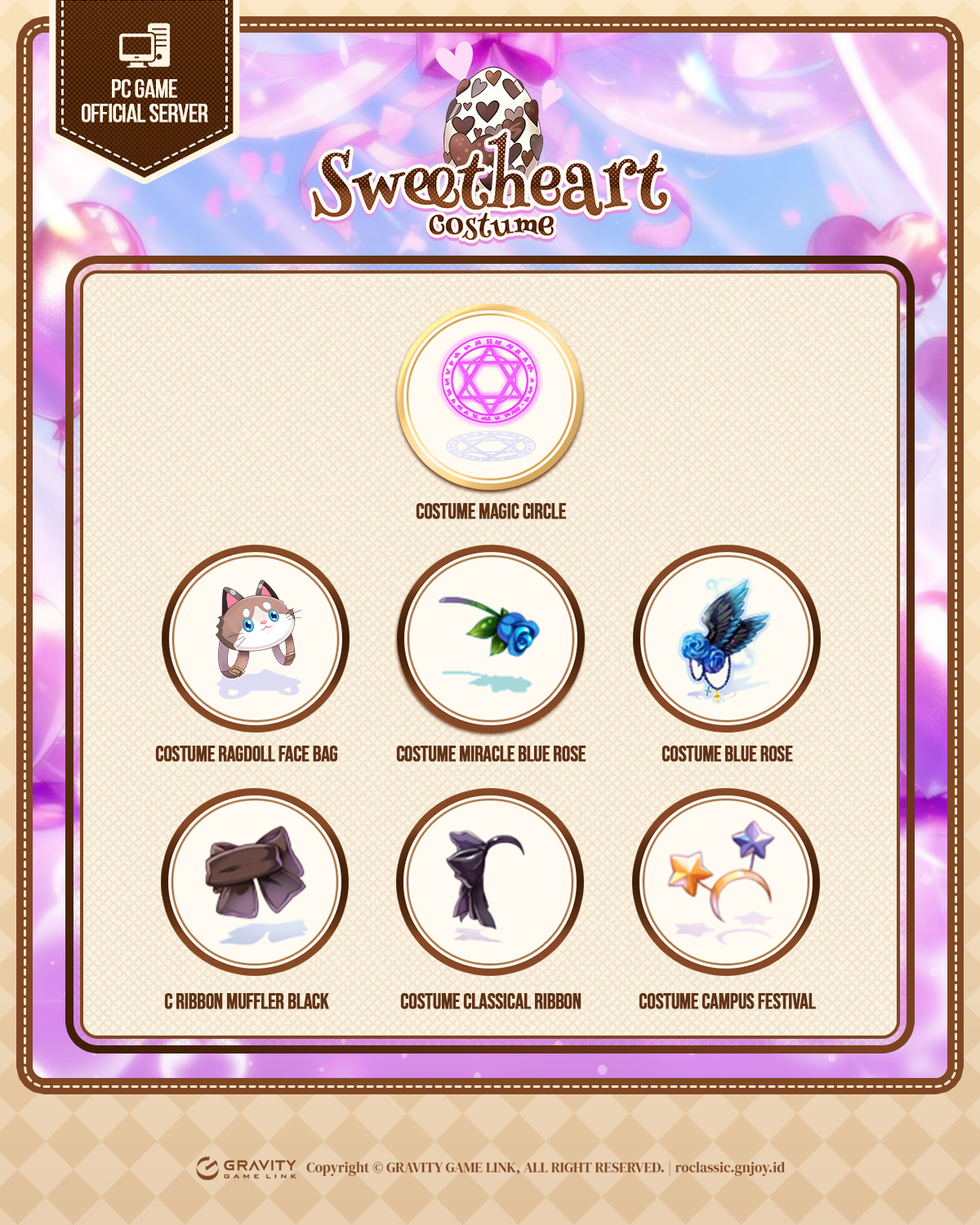 Dengan menukarkan 20 buah Silvervine ke NPC Machine Gacha Costume, kamu akan mendapatkan 1 buah SWEETHEART'S SECRET COSTUME SCROLL dan mendapatkan 1 buah Costume Eksklusif secara acak.