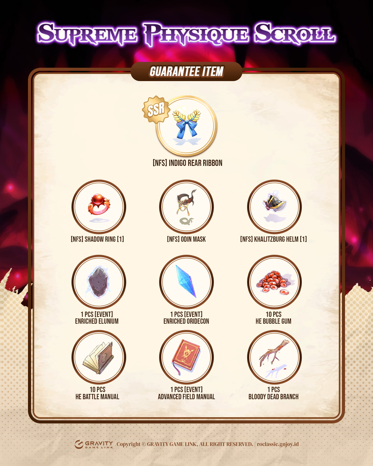 *Note : Ini hanya berlaku untuk Supreme Physique Scroll 2025. - Namun, jika karaktermu sudah mendapatkan item tier SSR sebelum mencapai Guarantee ITEM SSR , maka Guarantee Point di karaktermu akan direset menjadi 0.