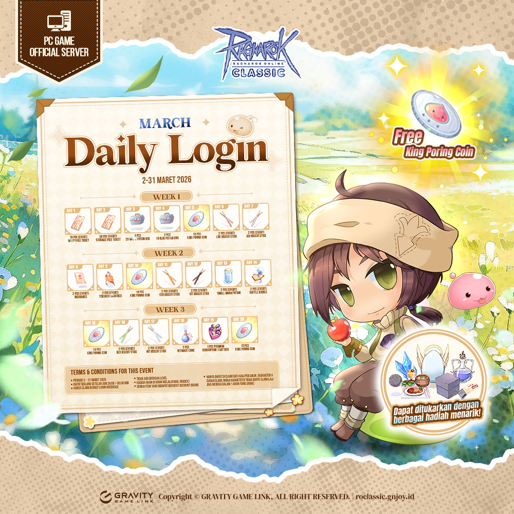Tim Ragnarok Classic telah menyiapkan event beserta hadiah-hadiah menarik untuk dinikmati RO Mania sekalian, yakni Event Daily Login March 2026! Hanya dengan login ke Ragnarok Classic setiap hari selama periode event berlangsung, kamu bisa mendapatkan hadiah-hadiah menarik dan King Poring Coin yang bisa ditukarkan kembali menjadi hadiah hadiah yang tidak kalah bagus~! Menarik bukan? Yuk simak selengkapnya di bawah ini!