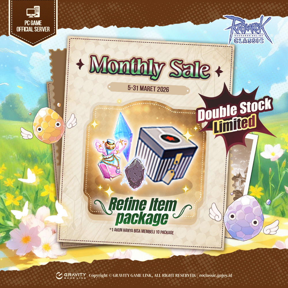 Monthly Sale Refine Item Package hadir lagi loh bulan ini, Tim Ragnarok Classic sudah menyiapkan MONTHLY SALE yang berisi kebutuhan-kebutuhan tempa untuk RO Mania!