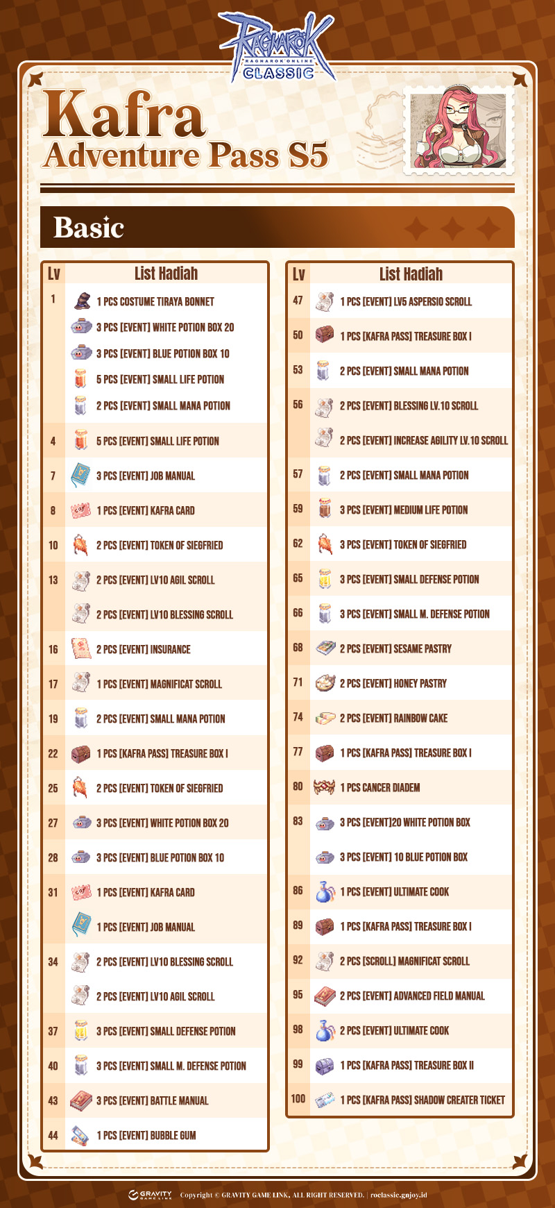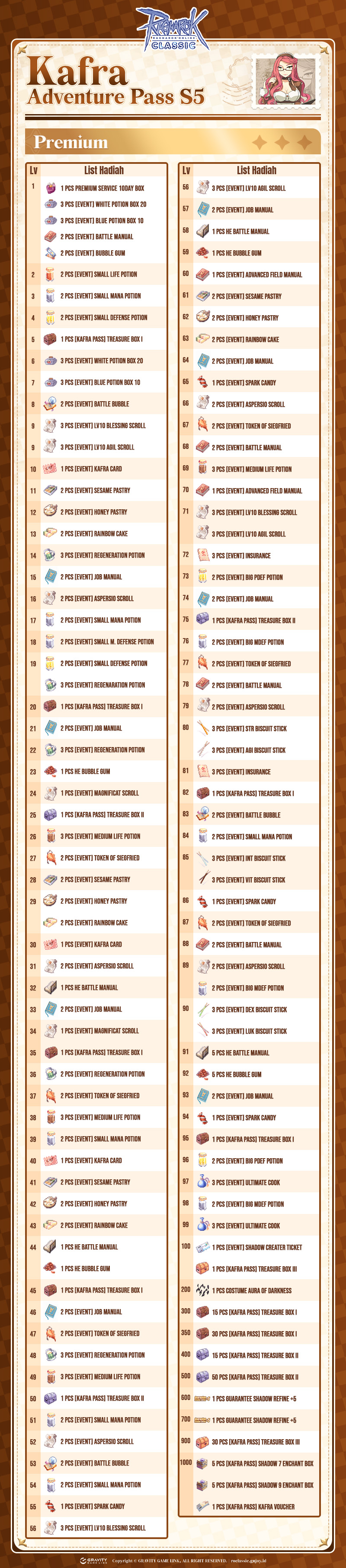Catatan: Kamu juga akan mendapatkan hadiah Basic Kafra Pass jika kamu memiliki [Premium] Kafra Adventure Pass.