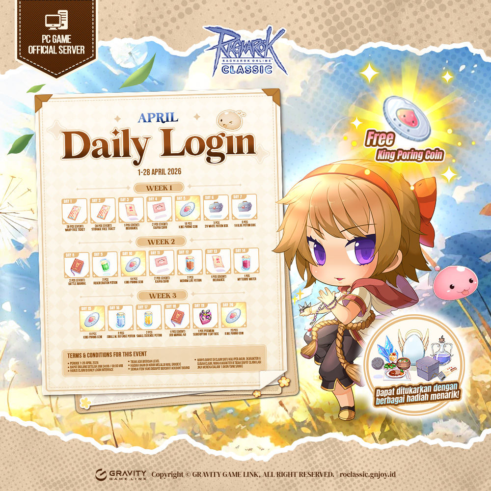 Tim Ragnarok Classic telah menyiapkan event beserta hadiah-hadiah menarik untuk dinikmati RO Mania sekalian, yakni Event Daily Login April 2026! Hanya dengan login ke Ragnarok Classic setiap hari selama periode event berlangsung, kamu bisa mendapatkan hadiah-hadiah menarik dan King Poring Coin yang bisa ditukarkan kembali menjadi hadiah hadiah yang tidak kalah bagus~! Menarik bukan? Yuk simak selengkapnya di bawah ini!