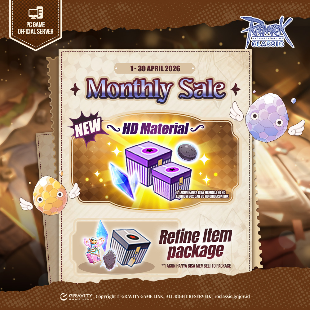 Monthly Sale Refine Item Package hadir lagi loh bulan ini, Tim Ragnarok Classic sudah menyiapkan MONTHLY SALE yang berisi kebutuhan-kebutuhan tempa untuk RO Mania!