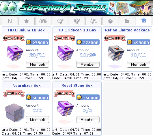 - Setiap akun hanya bisa membeli 10 REFINE PACKAGE, 20 HD Elunium Box, 20 HD Oridecon Box