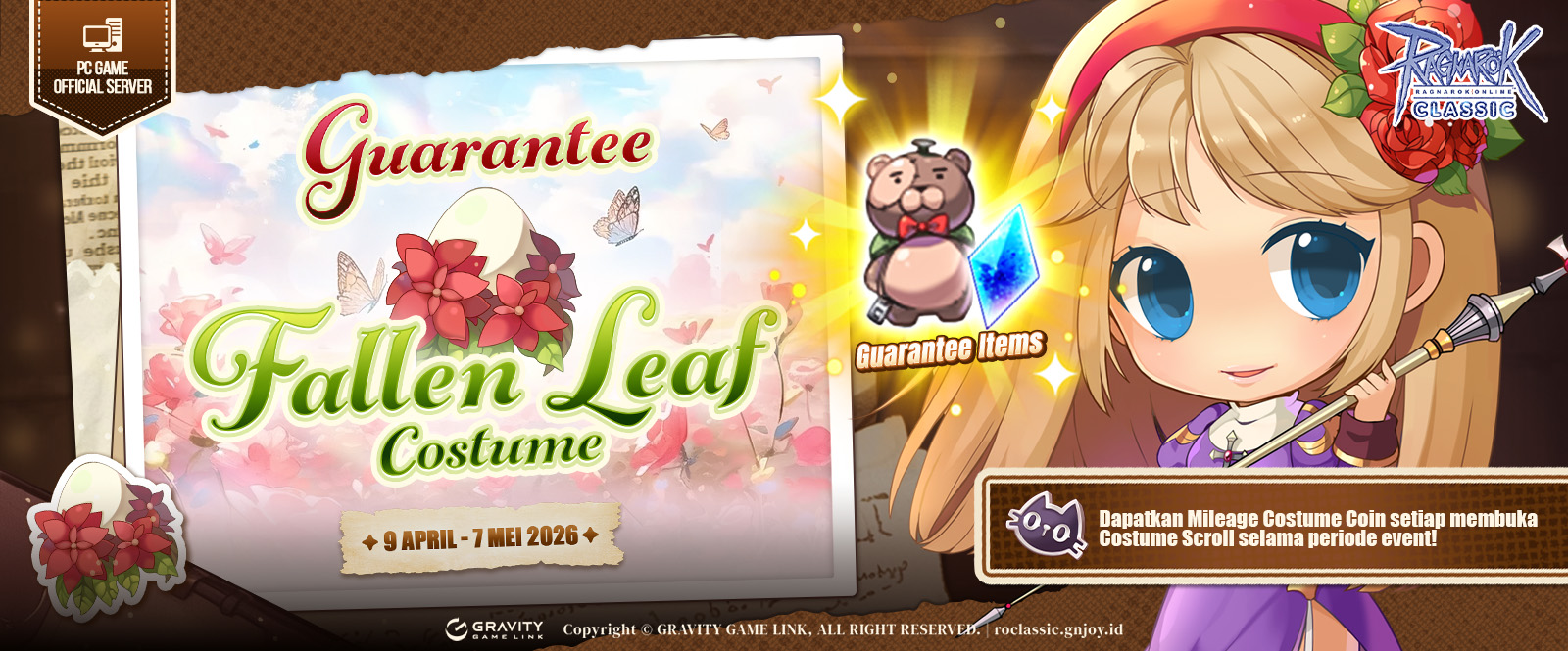 - Kamu akan mendapatkan 1 buah Mileage Costume Coin untuk setiap kali kamu membuka FALLEN LEAF COSTUME SCROLL.