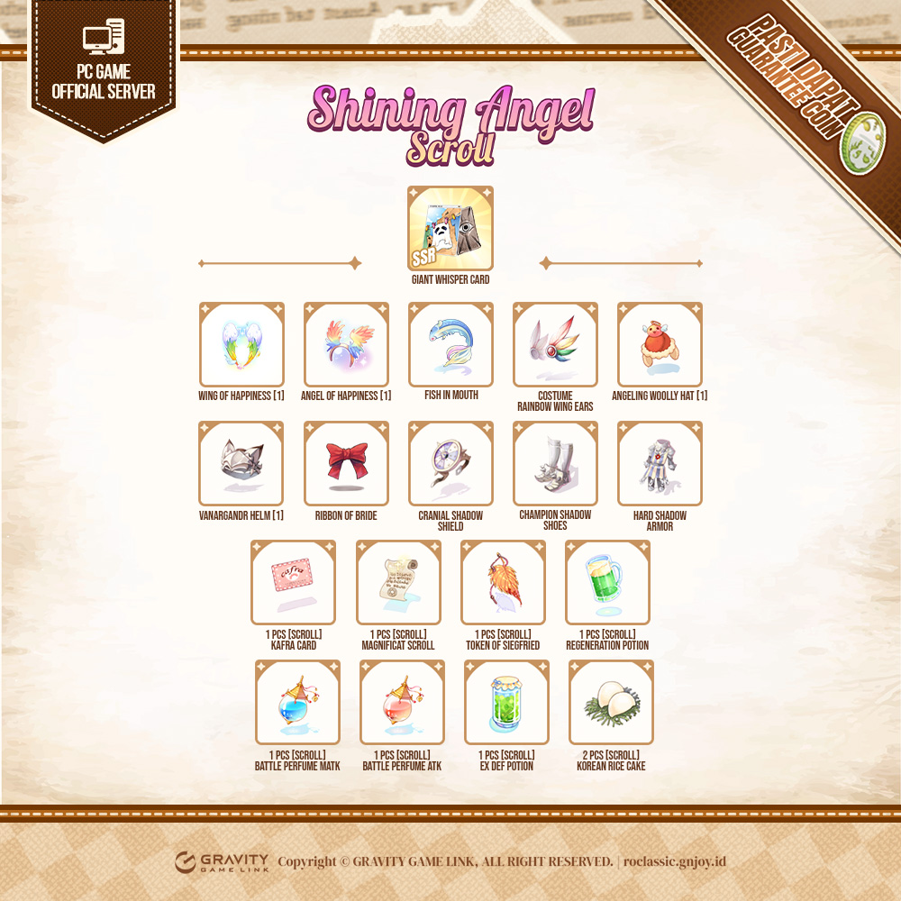 Dengan membeli Scroll ini, RO Mania sekalian memiliki kesempatan untuk mendapatkan berbagai macam item eksklusif secara acak dimulai dari: Headgear, Kostum, Shadow Equipmentatau Item Consumable~!